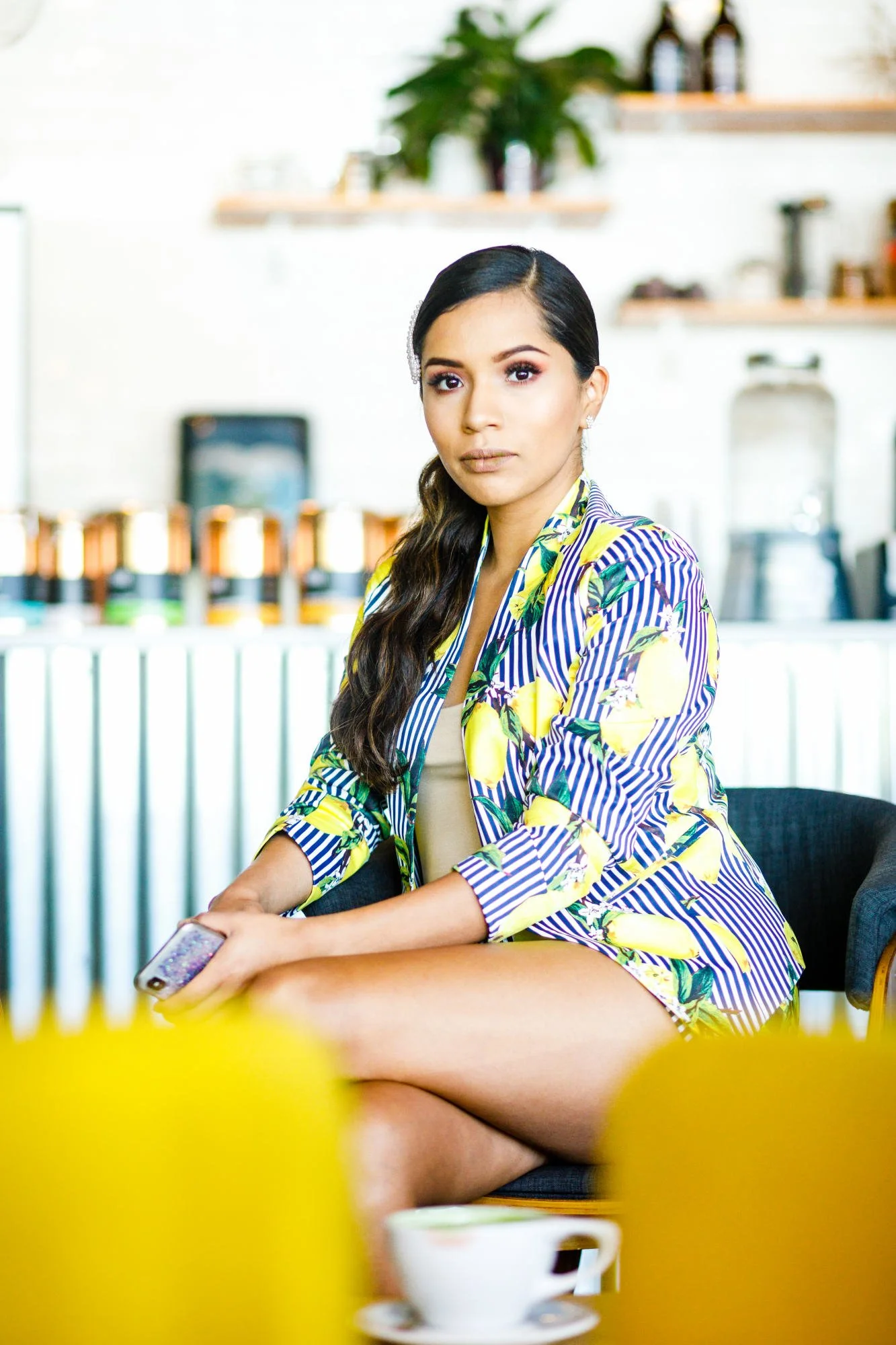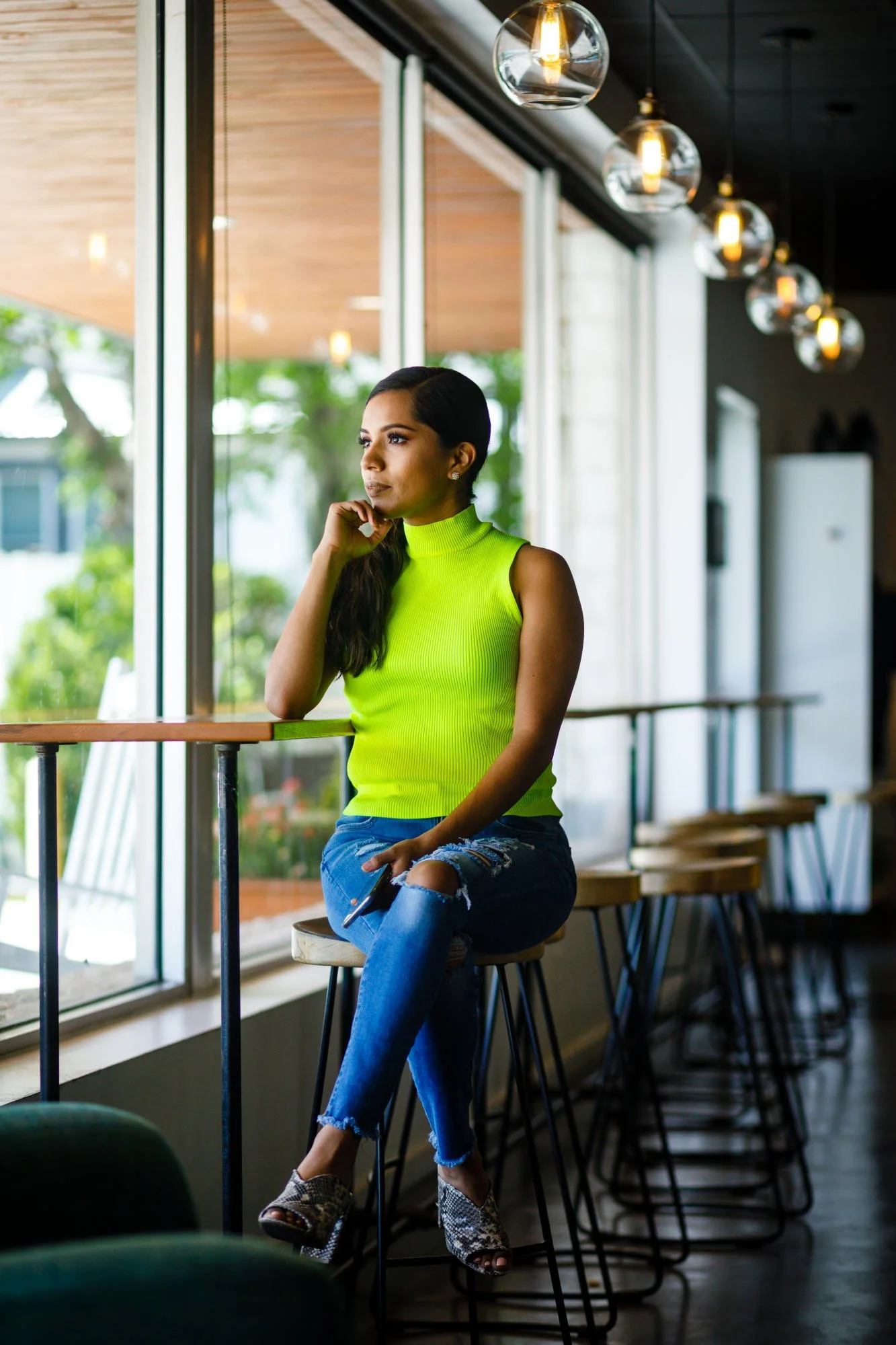 Haide describes this shirt as Neon Yellow on her own blog. Working with such a bold color, we used some of the more neutral areas of the coffee shop to balance out her outfit.