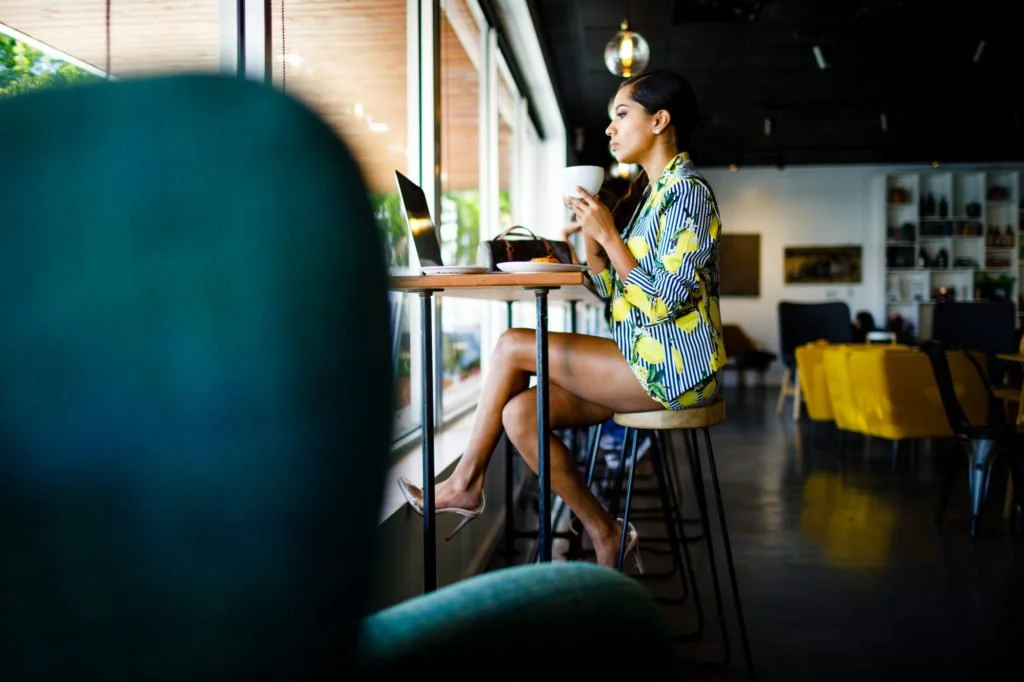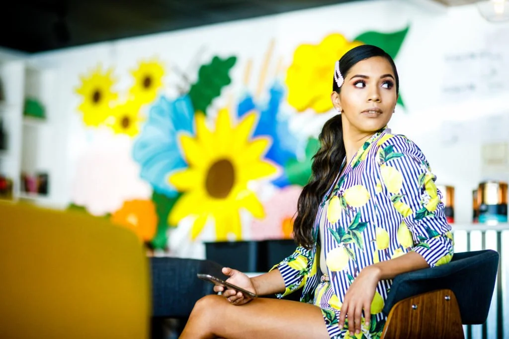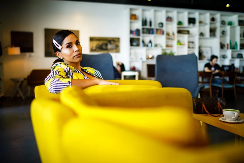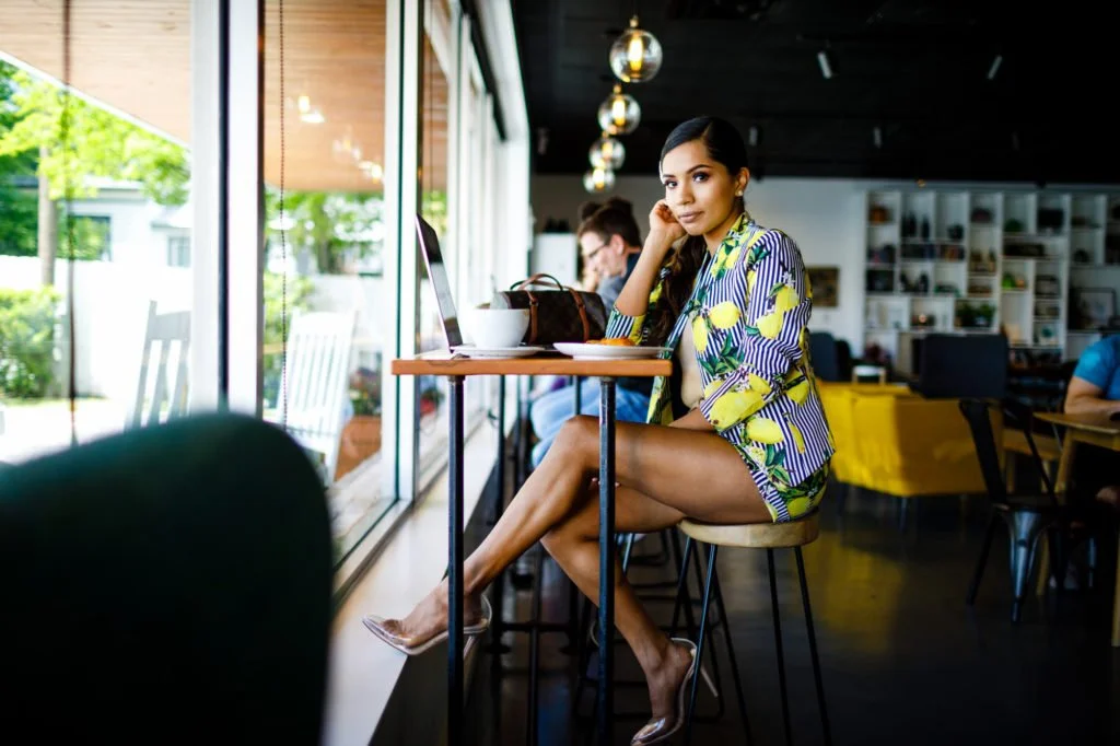 West Pecan‘s space is bright and airy, and also full of tasteful furniture and other elements. It makes a perfect location for a personal branding session like this. Haide favors bright colors in her outfits and they fit right in with the coffee shop’s brightly colored retro-style furniture.